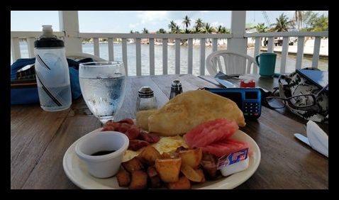 Last but not least, on Sunday I was invited to breakfast at Pier 366 on the water (located at Banyan Bay) for a Ruta Maya 2018 logistics meeting. It was a gorgeous day so I opted to walk from town. It took me about 30 minutes on the road. I was secretly hoping to hitch a ride but not disappointed that I didn’t as the walk there and back gave me a good hour of exercise. By the time I arrived, I was more than ready for eggs over, with bacon, potatoes, and fried jacks. It came with watermelon and strawberry jam which was a nice change as I usually do butter and honey drizzled over my fried jacks. My breakfast also came with a lesson. As Tinker raced up to the table and saw the plate that was just set in front of me, I learned that I am in like Flynn as far as she is concerned, barely gave me a look as she reached over and pinched a piece of my bacon. This is a great spot to go if you want a reasonably priced breakfast away from it all but not too far. The staff was very accommodating. Find out what other foodies thought of their Pier 366 Seafood House experience.