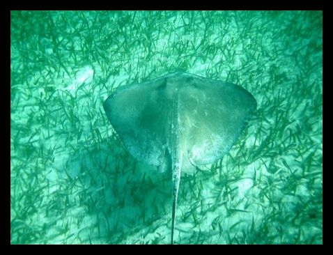 Seagrass beds serve as a protected area for young fish who use it to hide from predators while they grow to adulthood. If you are on a snorkeling tour, have a closer look on your way from the boat to the reef and you will likely see some juvenile marine life. Below are a few seagrass pictures. The one on the right shows you how seagrass and coral can be symbiotic and notice the small fish on the left, I included the middle one because I thought it was cool how the ray is like a hovercraft gliding across the seagrass bed at Shary Ray Alley, a popular snorkel spot.