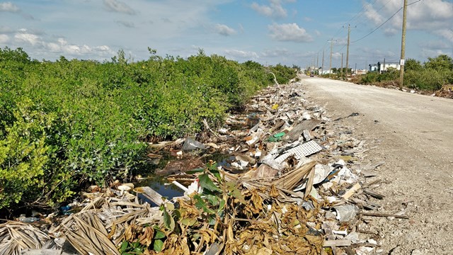 After that mission was accomplished, Randy had to go home to wash his feet and sterilize his flip-flops. Susan and I were not done yet, so our next mission was to go drive to the end of the huge garbage road just south of DFC. When we arrived we were happily surprised. Although we are not quite sure where it went (we saw a bulldozer leveling stuff out) or who moved it, the difference at the start of that road between then and last week was incredible. Notice the green roof house as the landmark. The picture on the left was taken November 9th – day one of the Ambergris Caye Clean Up Campaign, and on the right-hand side was yesterday, November 21st. Amazing difference.