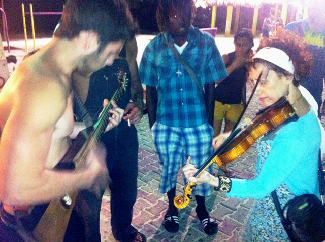 Henry, a hugely talented massage therapist on the island,(just ask tacogirl how to get a hold of Henry if you need the best massage of your life while you are on Ambergris Caye. Believe me, this guy can fix what ever pains ail you!), left me to my own devices some afternoons to wander the island when he had massage clients. I bumped into a slew of Jerry Jeff Walker musicians one afternoon taking over the stage at Wet Willies and managed to find a fiddle lying around and join in. The bar was fun and rocking so it was great to be a a part of that. Another evening…actually one in the morning, after a Tuesday night jam, we passed the San Pedro square where “street meat treats” were still being sold as the bars let out. And here, I found three young Jerry Jeff tourists from St. Ignacio jamming in the square with guitars and ukeleles. I was happy to join in for an hour of musical fun to the amusement of the hungry bar crowd.