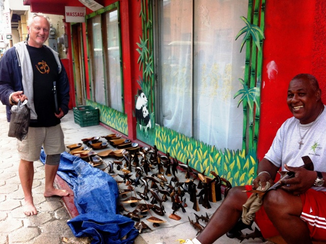 My stay in San Pedro was not the usual tourist resort stay, since I had the pleasure of staying with Henry in his home in town. My experience was less touristy and more laid back, buying fruit and vegetables at the local fruit stands and cooking at home. Most notable, I managed to land in San Pedro during the famous Jerry Jeff Walker Camp Belize that happens every year. And this guy has quite a following of fans that follow him to this lovely island paradise. Now I happen to be an improvisational fiddle player and I brought my fiddle along. And amongst Jerry Jeff’s followers are a gaggle of musicians/jammers who coincided exactly with my stay there. So I was happy as a clam as I ran into all these tourists who can actually play!! In addition, Henry, a well known African drummer/percussionist took me to all his gigs. One of his main gigs in San Pedro takes place every Wednesday at Wet Willies Cantina, a rockin’ bar that is located on the beach off a long pier over the water. Henry and his fellow musicians, Tull, Keith and Steve like to call this their Tuesday Jam because they invite tourists who are also musicians to join them in an endless array of well known cover tunes. You never know what will happen at these jams. The boys were gracious enough to allow me, the fiddle player, to do 3 sets with them every Tuesday that I was there. Thanks guys!!