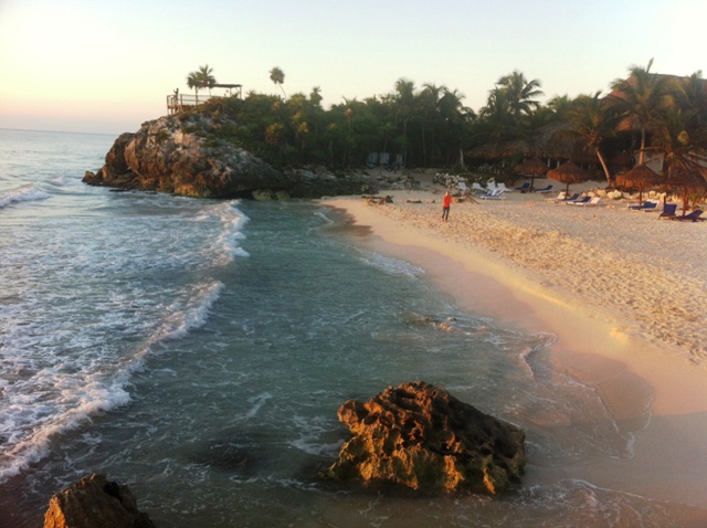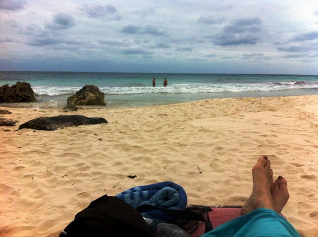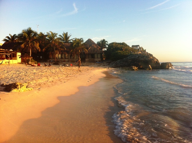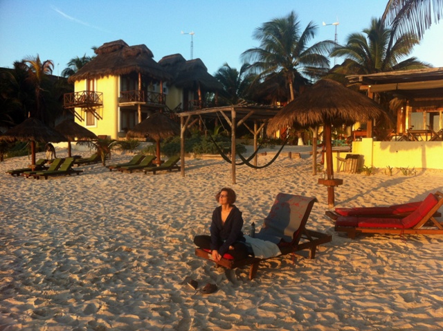 The trade off is that you still have to get from Cancun to Belize which requires staying overnight in Mexico. But I’d rather travel in the tropics and begin my holiday early than wait around for hours in various US airports. Henry promised he’d meet me in Cancun and we’d make a holiday of it, winding our way slowly South to Belize. And even more fun, we were meeting a third Winnipeg friend in Tulum, Mexico where we thought we’d stay for a few nights before heading South. Tulum It is a lovely laid back resort town with great beaches and a 2h jaunt fromthe Cancun airport. We managed to get a basic oceanfront cabana with a private bathroom for $45 usd/night for double occupancy at the EcoTulum resort Zahra. The website at describes it as “rustic cabanas at traditional Mayan style, just aside the Caribbean Sea at Tulum”. We liked it so much we ended up extending our stay a few days longer just to laze on the beach, do some yoga and eat fruit we’d bought at the roadside fruit truck.