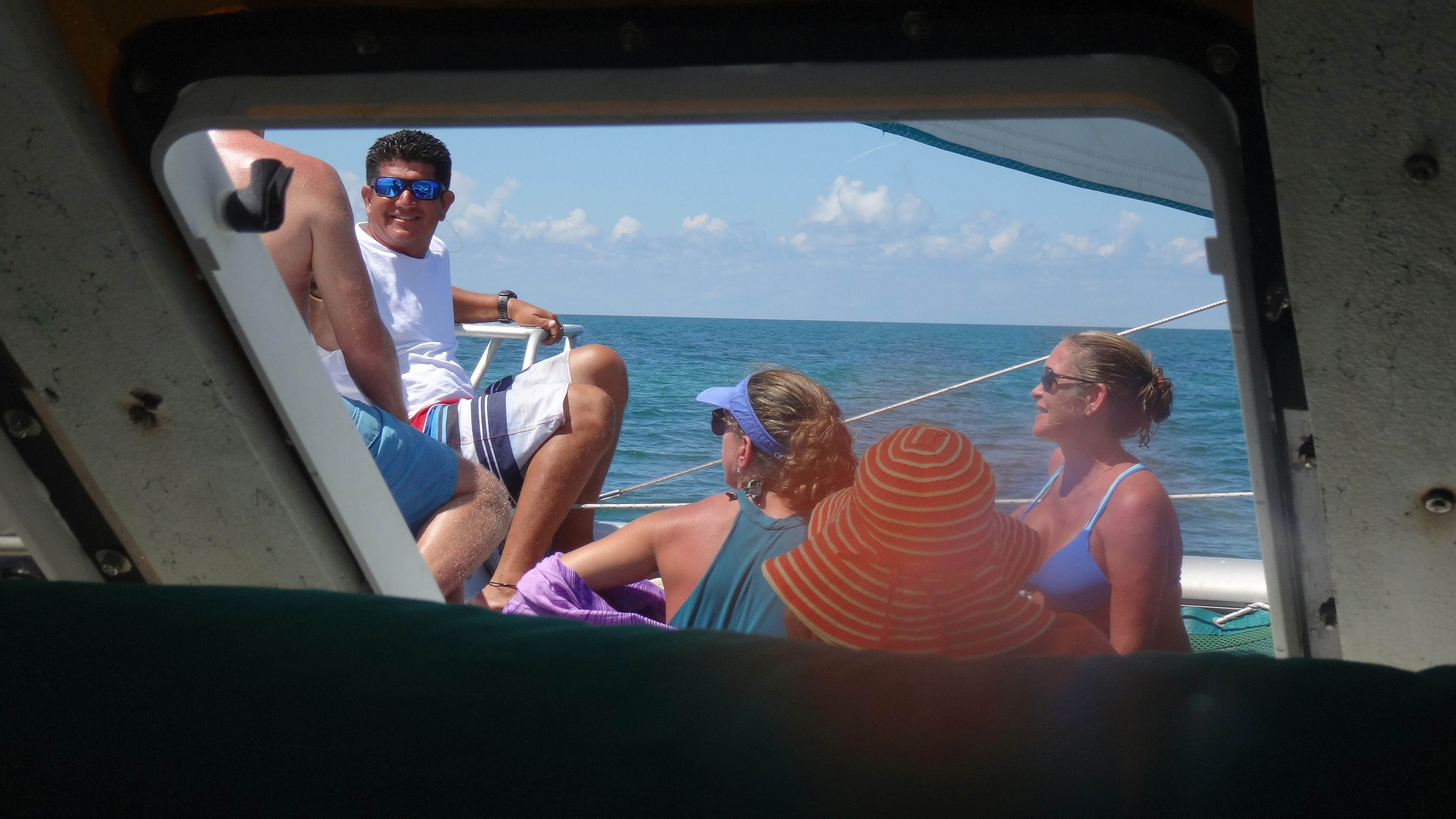 Our first stop was Sargeant Caye, where a few of the girls opted to do some sea glass hunting as this is a known spot for old bottles. There was a small bit of sandbar sticking out giving us a bit of island to lounge on. We also got a nice easy exercise by swimming to the boat and back. Some of us had it easier than others on the way there as we opted for the barnacle float. One of the boys offered to pull my shade sisters Karen and Heather to the sandy patch, so I decided to join that ride. I did help to act as a spare motor because I was wearing flippers.
