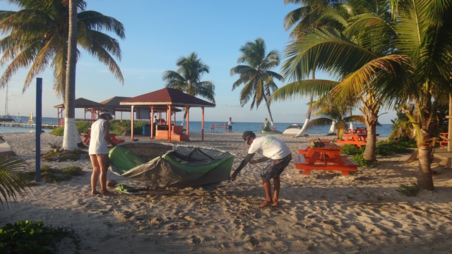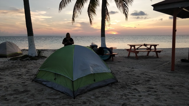There is nothing like sailing up to a small private island, in our case Goff’s Caye, and pitching your tent on the beach. Actually, I only assisted pitching the tent (see above) after I finished playing Sheldon, (from the Big Bang Theory) walking around to find just the right spot. I had to get familiar enough with the airflow patterns, the direction of morning sunlight, and general location to make an informed choice. We wanted to get a good breeze and be in the country on the sunset side of the island. Heather and I had only one neighbor beside us compared to the sunrise side; it was a bustling metropolis of at least five tents 😀