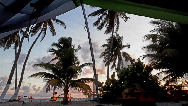 After a leisurely travel day on the water, imagine pitching your tent on a 1.2-acre island in the middle of the Caribbean just in time for a sunset swim. Heaven.