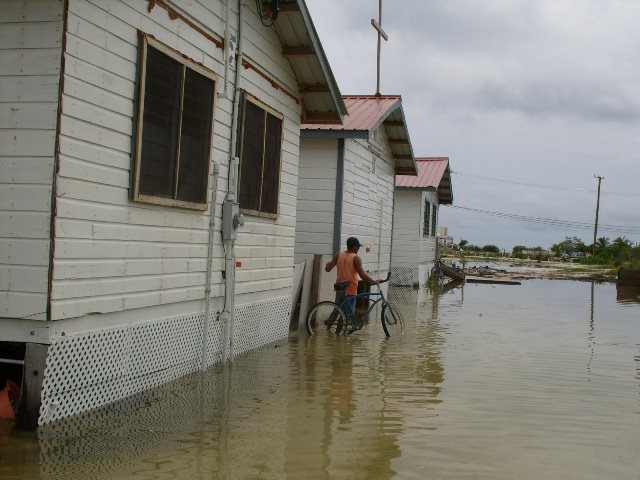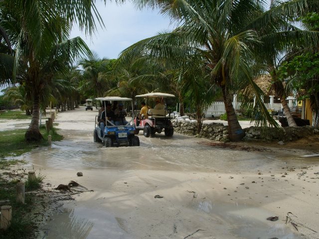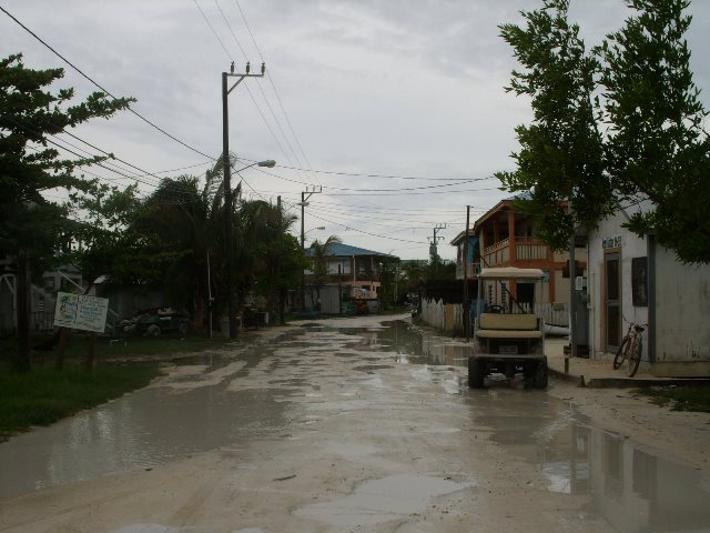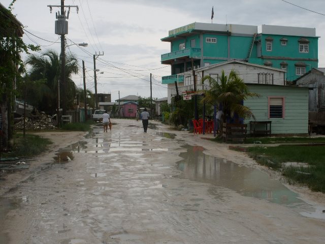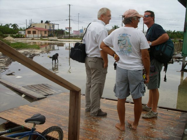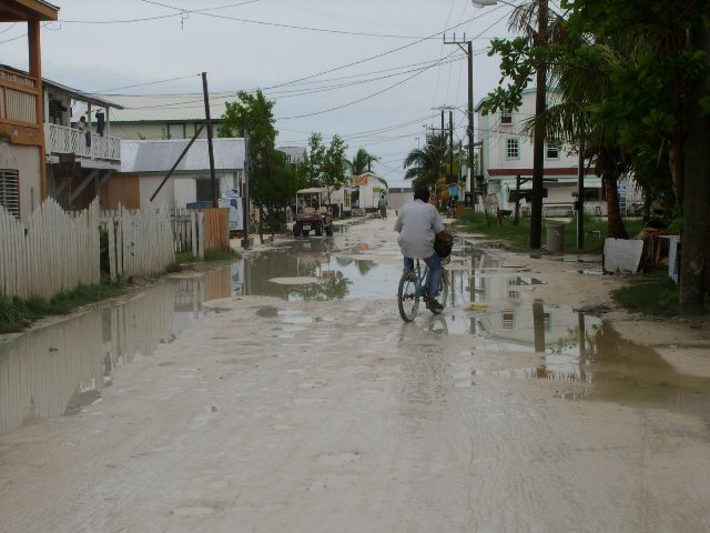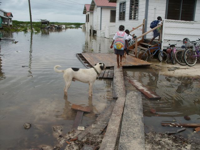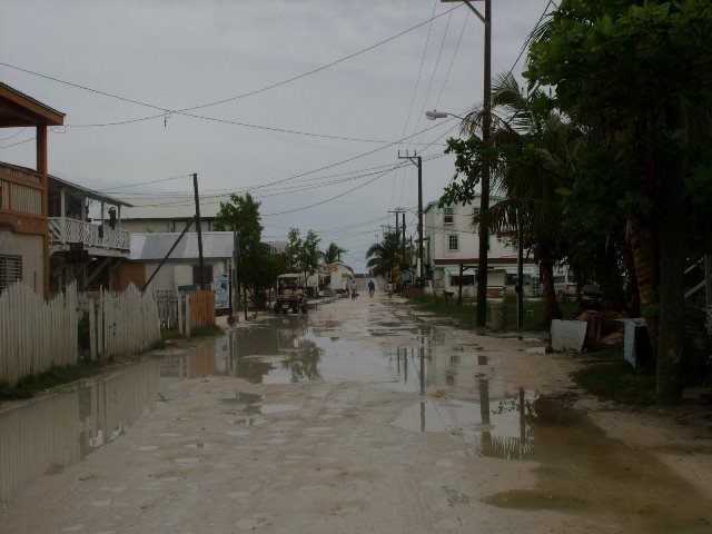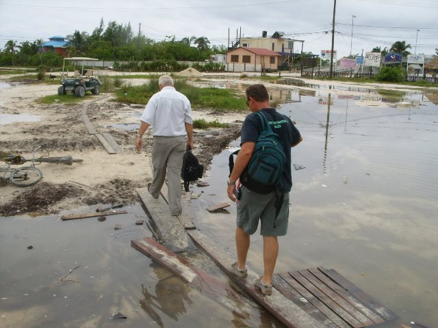 As I walked through Boca Del Rio to go to the school and meet Paul Tranter and Paul Bird from Johnston International Ltd. Belize City as they generously donated use of their barge to bring furniture to the school. I saw the roads were in their normal rainy state, I had no idea about the lakes I was about to find across the bridge. Needles to say if you are heading to San Pedro it is a good idea to have some water shoes. Miss Linda said it took her one hour to walk from Palapa Bar to the school this morning.