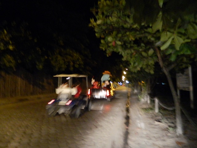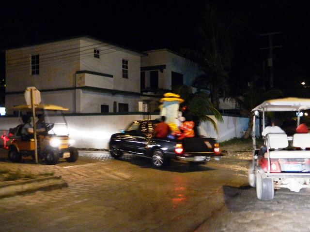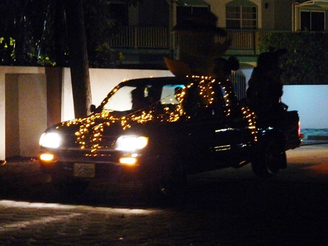 For some reason this year the spirit of Christmas has just not hit me. For the past 8 years (almost) we have lived here I have always enjoyed taking pictures of all the colorful and sometimes tropical decorations as many people and businesses in San Pedro town go all out. This year I have only made one attempt at Christmas pics. Friday night on our way home I tried to get a shot of the wings pickup truck all decorated with lights, a strange tall character, and Micky and Minnie mouse on the back. We both had a good laugh at their live drive by commercial, unfortunately, it all happened so fast and my camera settings were not right so all my pictures came out fuzzy or as crazy light images. Paul said I should post some anyways, so in the spirit of the fun time we shared at that moment, here are a couple of not so great pictures 🙂